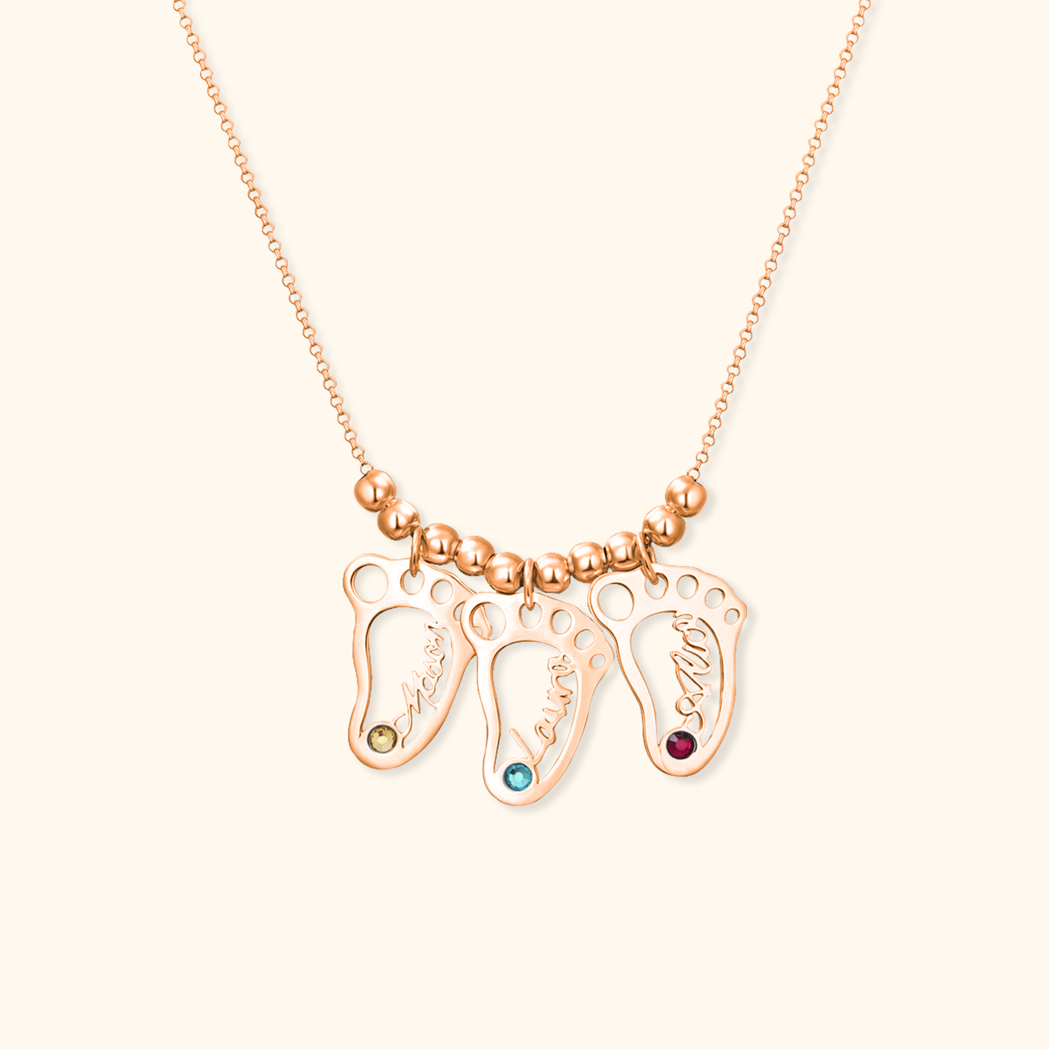 The Baby Footprint Birthstone Necklace is a tender tribute to the precious steps your little ones take, capturing the innocence and joy of childhood in a beautifully personalized piece. The pendant, shaped like a baby's foot, can be personalized with a name or text and a small birthstone, representing your child's birth month. This necklace can hold up to six individual foot pendants, each a unique and heartfelt reminder of the little ones who hold a special place in your heart.