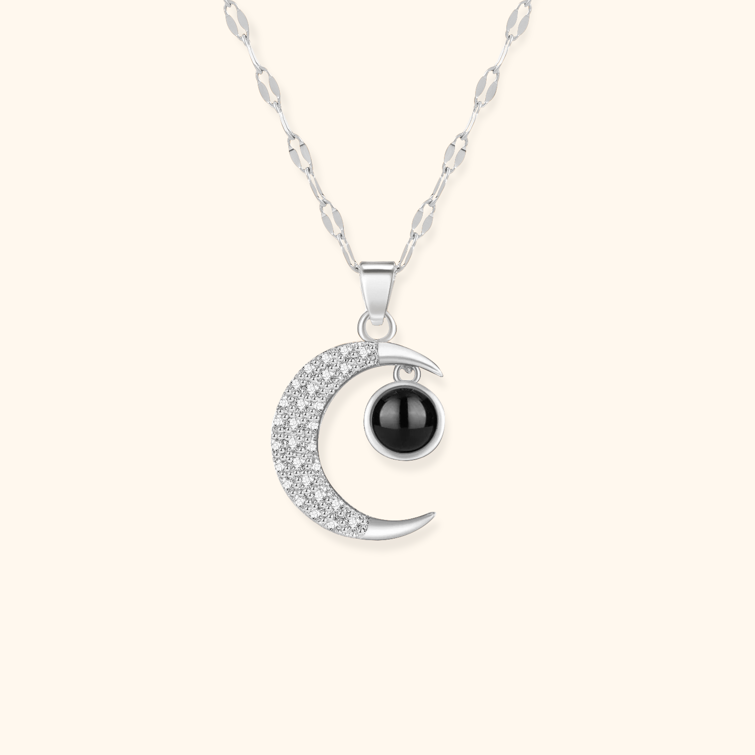 The Crescent Moon Photo Projection Necklace is a captivating piece of jewelry that embodies protection, transition, and the promise of new beginnings. The pendant is shaped like a crescent moon and is adorned with sparkling cubic zirconia stones, adding a touch of celestial beauty. The customizable photo projection charm inside the pendant allows you to carry a cherished memory close to your heart, which is revealed when you look inside.
