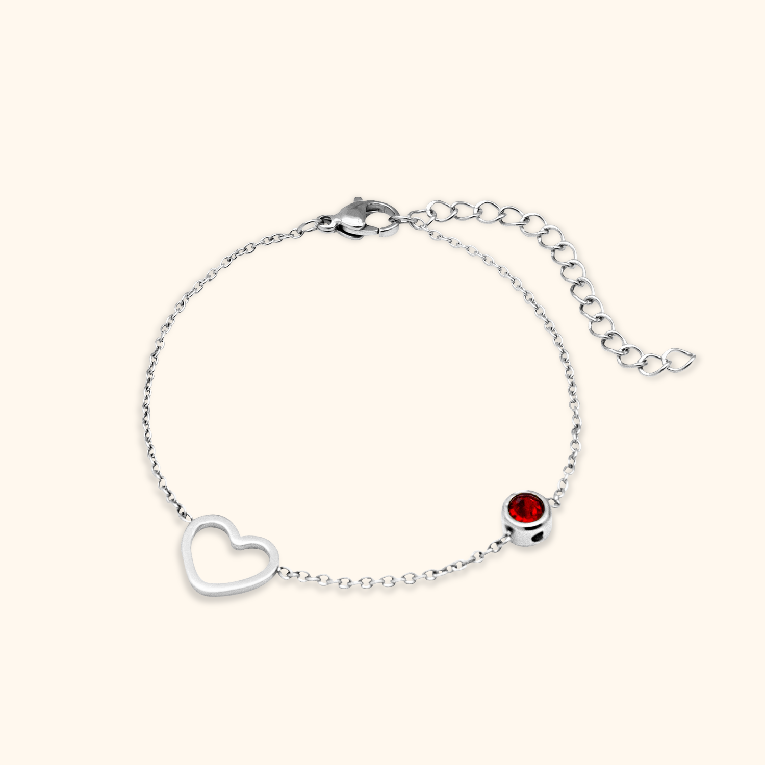 Elevate your style with our Elegant Heart with Birthstone Bracelet, a stunning symbol of love and individuality. Featuring a delicate heart charm adorned with a sparkling birthstone, this bracelet offers a personal touch perfect for celebrating life's special moments. Customize it with your birthstone or someone you love, and add a meaningful sparkle to your wrist.