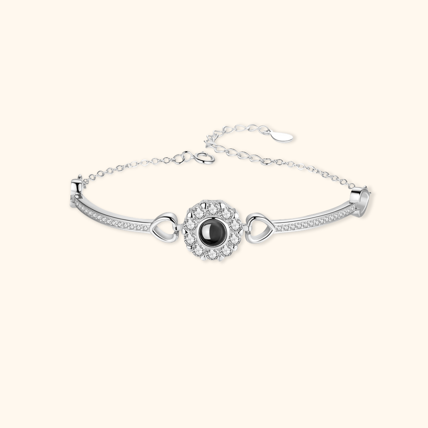 The personalized round projection bracelet is a beautifully crafted item that transforms cherished memories into wearable art. Featuring a round charm adorned with sparkling cubic zirconia stones, this bracelet allows you to personalize it with a photo that is projected when viewed inside. It's a meaningful way to carry the people and moments that mean the most, keeping them close to your heart at all times.